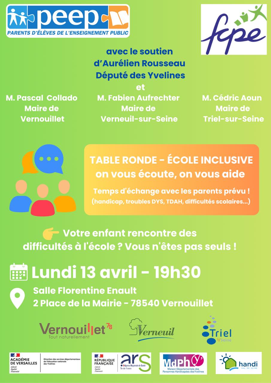 Les Fédérations de Parents d’élèves FCPE et PEEP, en collaboration exceptionnelle avec Monsieur Aurélien Rousseau, Député des Yvelines, et les Maires des communes de Verneuil, Vernouillet et Triel, vous invitent à un moment fort d’échange et de solutions.