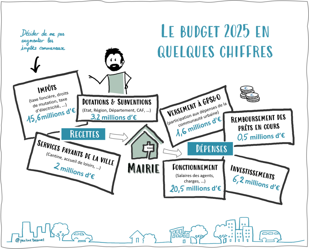 recettes proviennent des impôts locaux et taxes, des dotations de l’État, des prestations fournies à la population (cantine, crèches, centres de loisirs…). Les dépenses regroupent les charges nécessaires au fonctionnement de la collectivité : salaires du personnel municipal, entretien des bâtiments communaux, achats de matières premières et fournitures, prestations de services effectuées, subventions aux associations, intérêts de la dette…