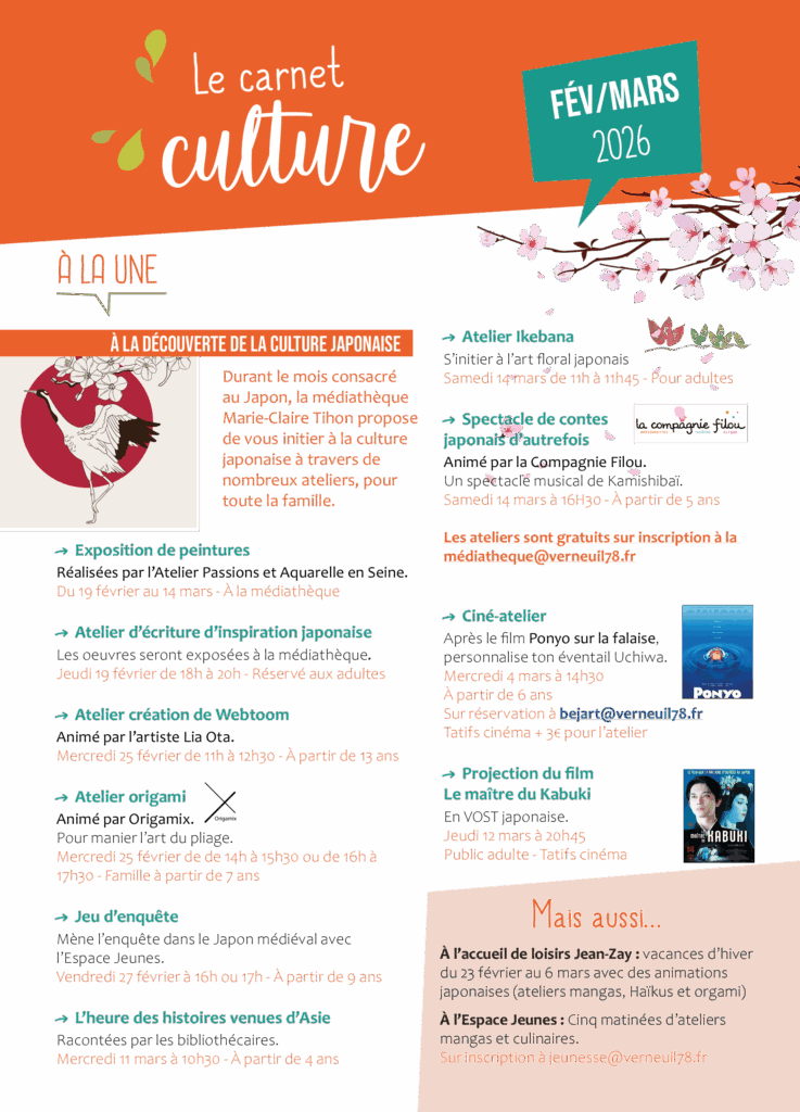 Tous les 2 mois, le carnet culture vous indique tous les rendez-vous culturels à ne pas manquer de l’espace Maurice-Béjart, de la médiathèque Marie-Claire-Tihon, de l’école municipale de musique et de danse et de l’espace culturel Arthur-Rimbaud.