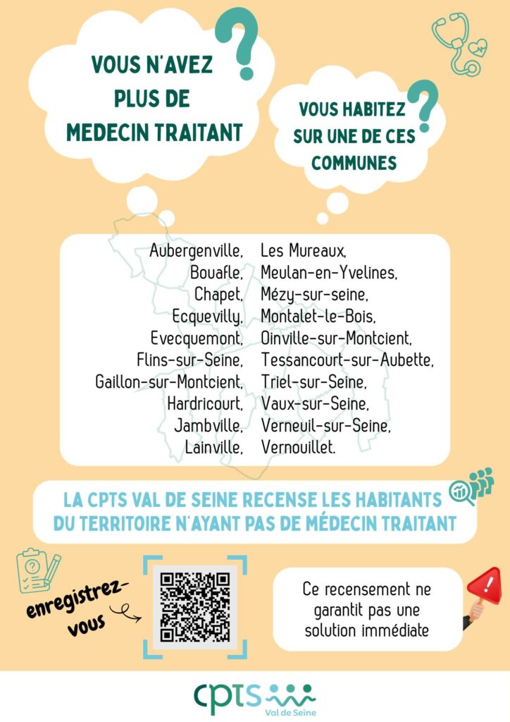 Afin de mieux répondre aux besoins du territoire, la CPTS Val de Seine met en place un recensement des habitants sans médecin traitant.